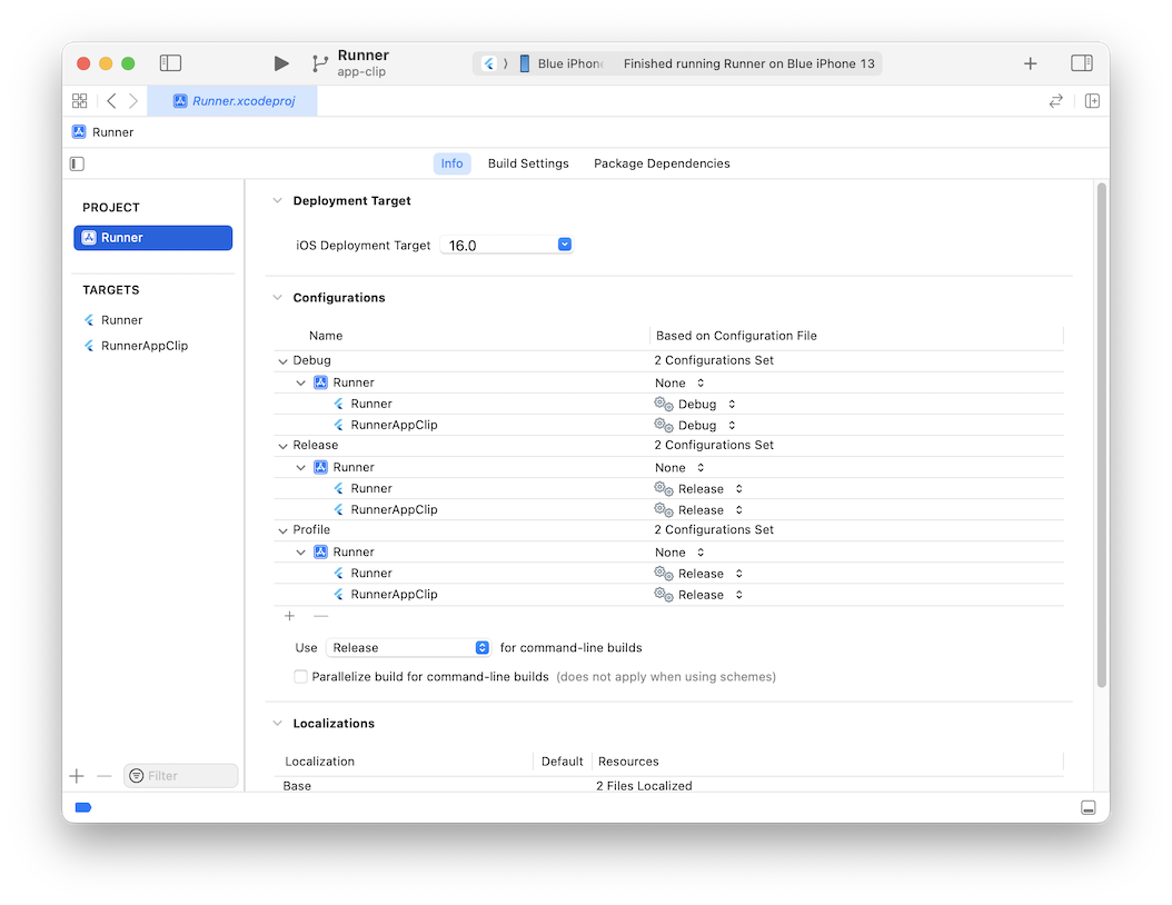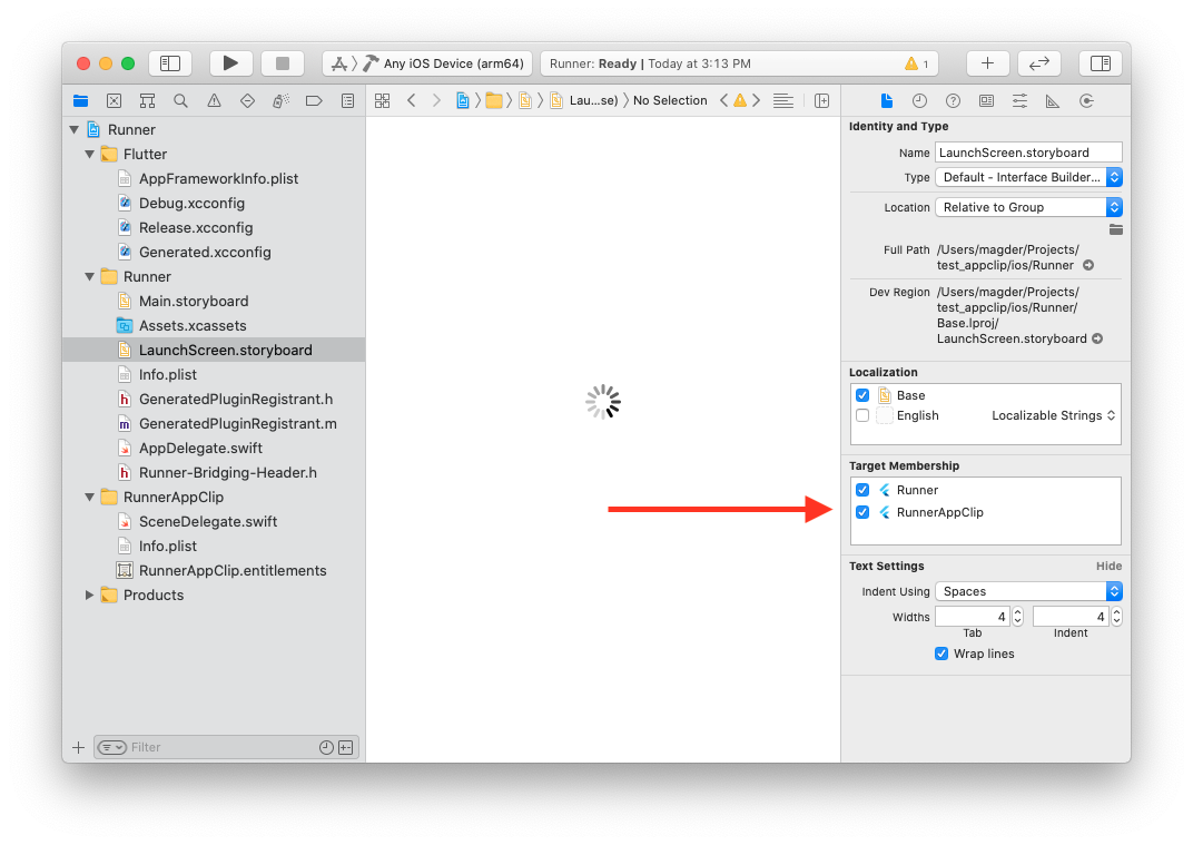 这使你的 App Clip target 可以访问 Flutter 所需的构建设置。