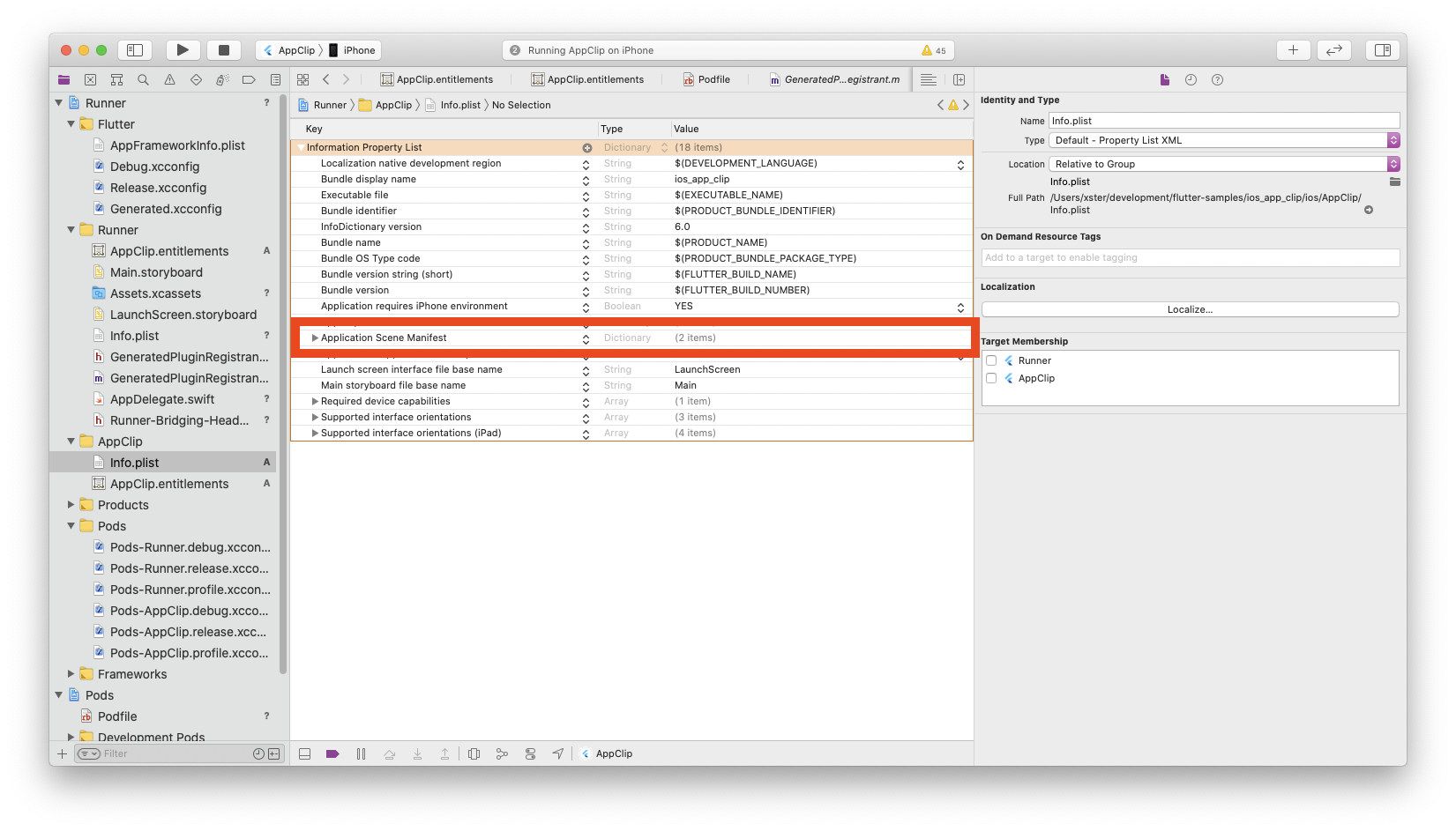 打开 App Clip 组中的 Info.plist。删除 Application Scene Manifest 字典条目。